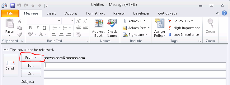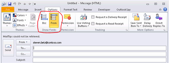 How do you get the “From” field to show up in new e-mail message? It’s easy, simply create a new e-mail message and then click on Options and then click on the “From” field from within the “Show Fields” group. Next, close the message without saving.